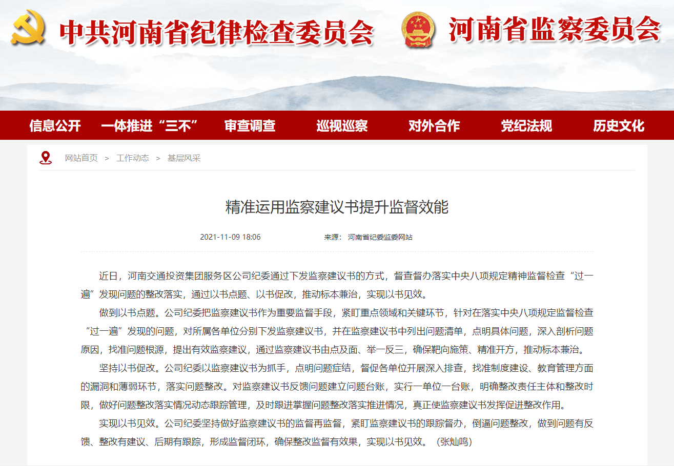 來源: 本站 發(fā)布時間: 2021-11-1111月9日,省紀委監(jiān)委外網(wǎng)首頁工作動態(tài)基層風(fēng)采專欄刊載公司紀委題為《精準運用監(jiān)察建議書提升監(jiān)督效能》的工作信息。公司紀委把監(jiān)察建議書作為重要監(jiān)督手段,以監(jiān)察建議書為抓手,督查督辦落實中央八項規(guī)定精神監(jiān)督檢查“過一遍”發(fā)現(xiàn)問題的整改落實,通過以書點題、…