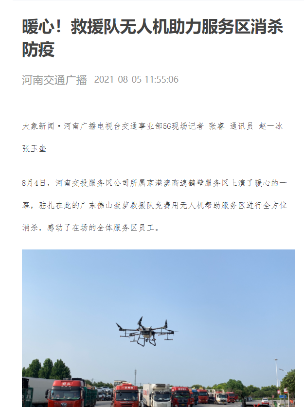 大象新聞、河南交通廣播、今日頭條:暖心!救援隊無人機助力服務區消殺防疫