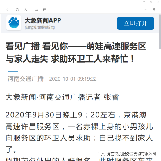大象網、微博視頻·河南交通廣播:看見廣播 看見你——萌娃高速服務區與家人走失 求助環衛工人來幫忙!